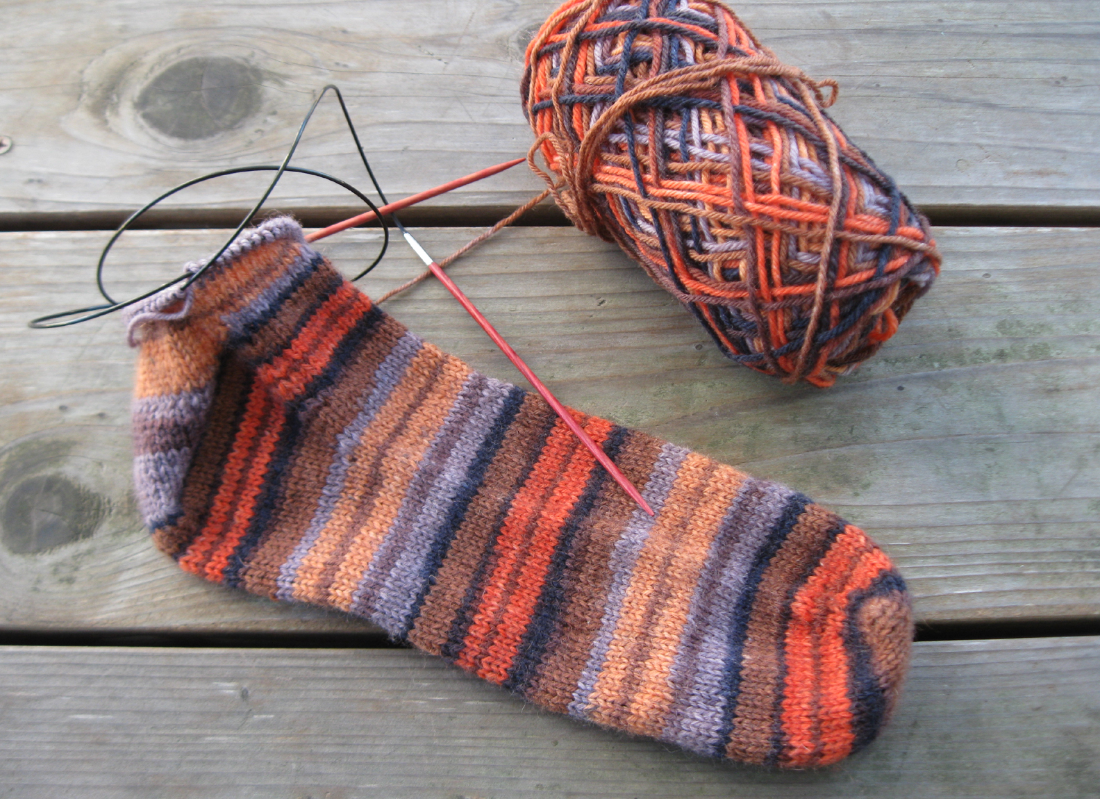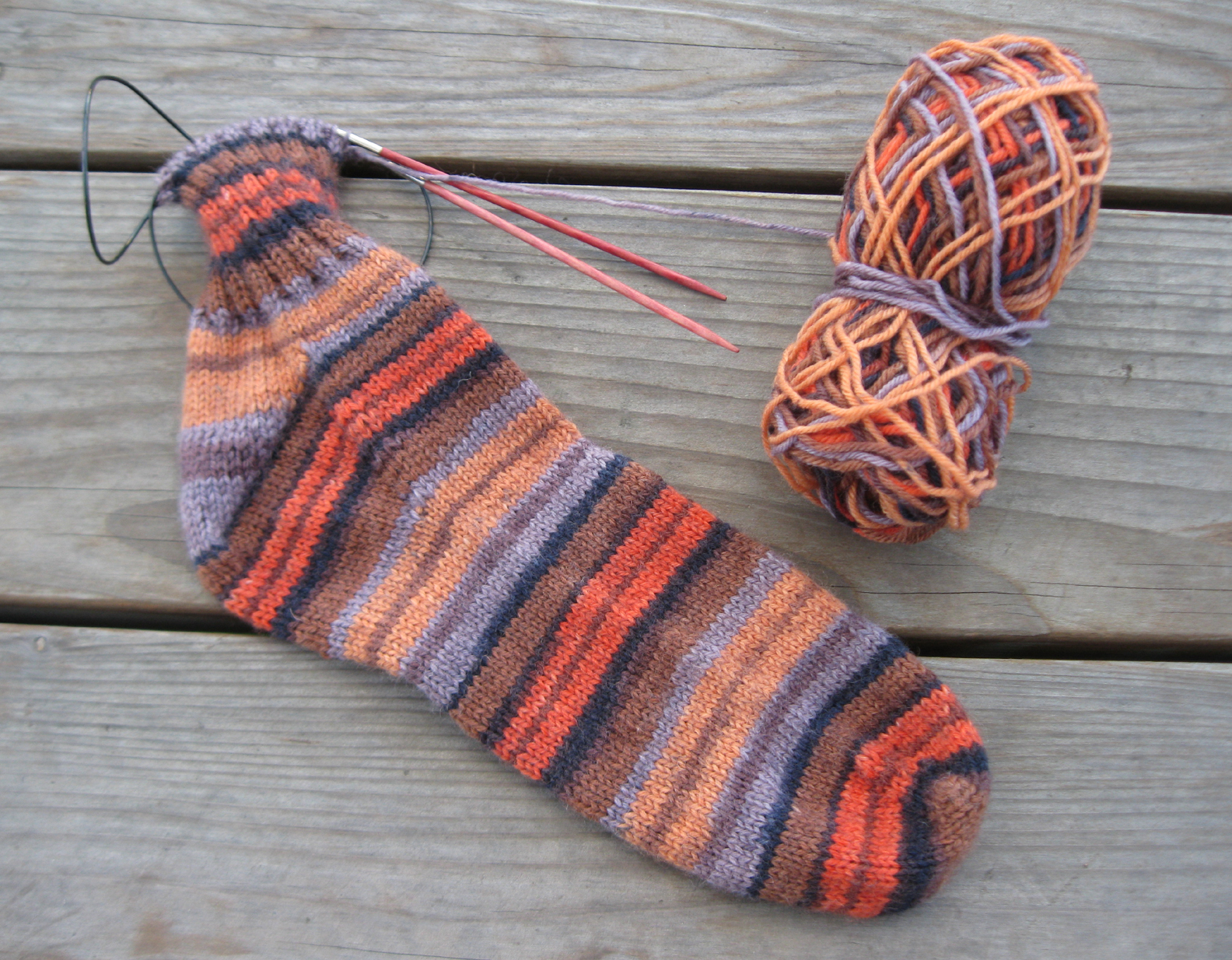 The good news is that I completed the mate to the toe-up purple hand-dyed merino wool sock that you’ve already seen in previous posts.  I also had the above orange and black striped sock that I started in Morro Bay and brought down to Ventura with me.  I got all the way to the heel today, but I wasn’t able to take a good photo because the sun was already setting when I got home.