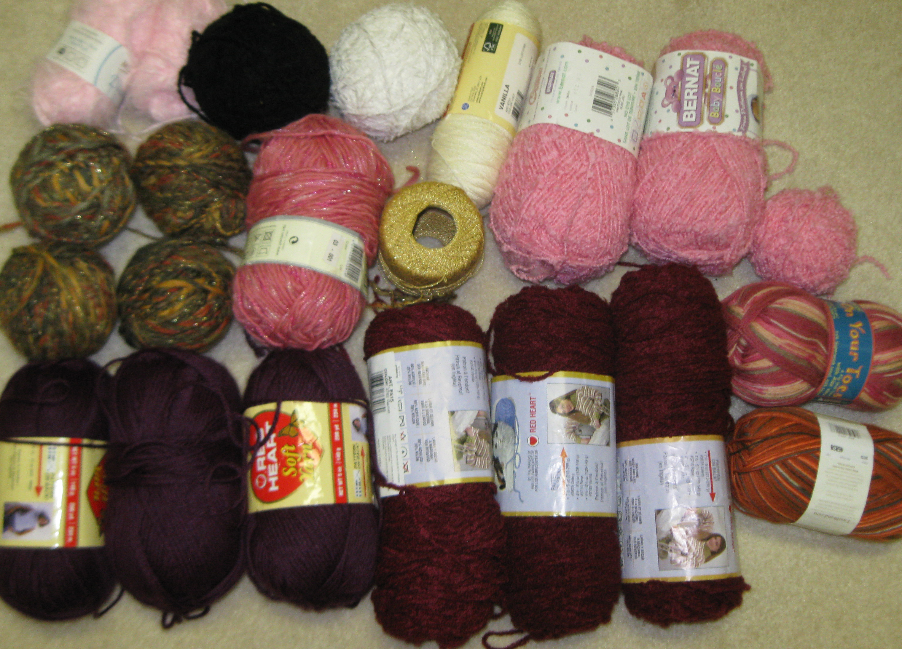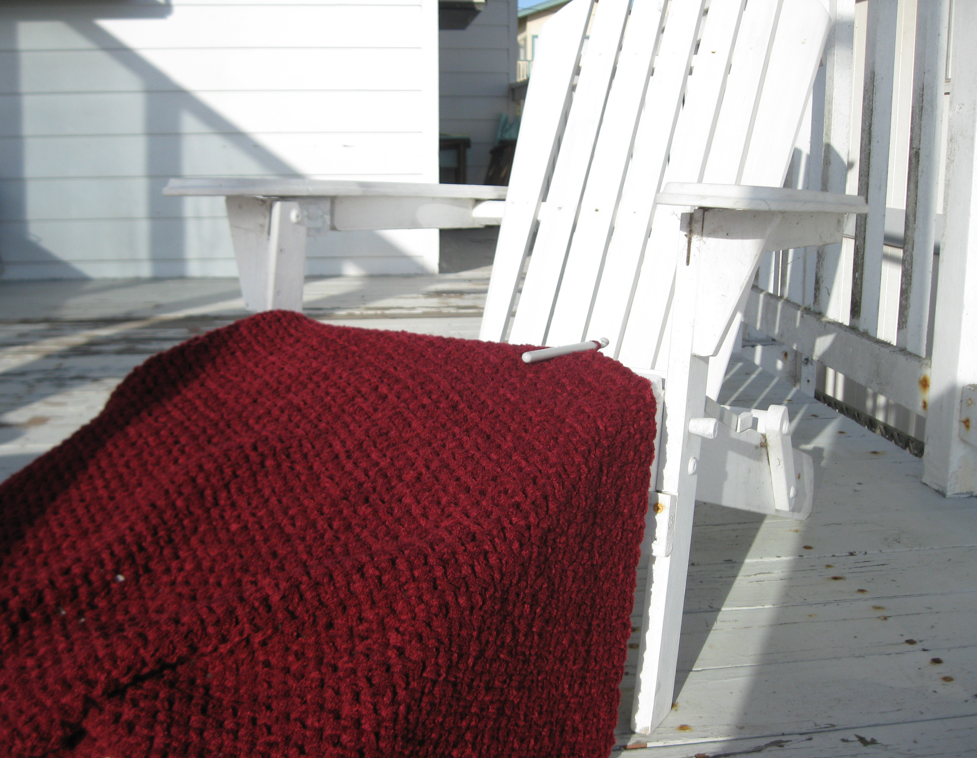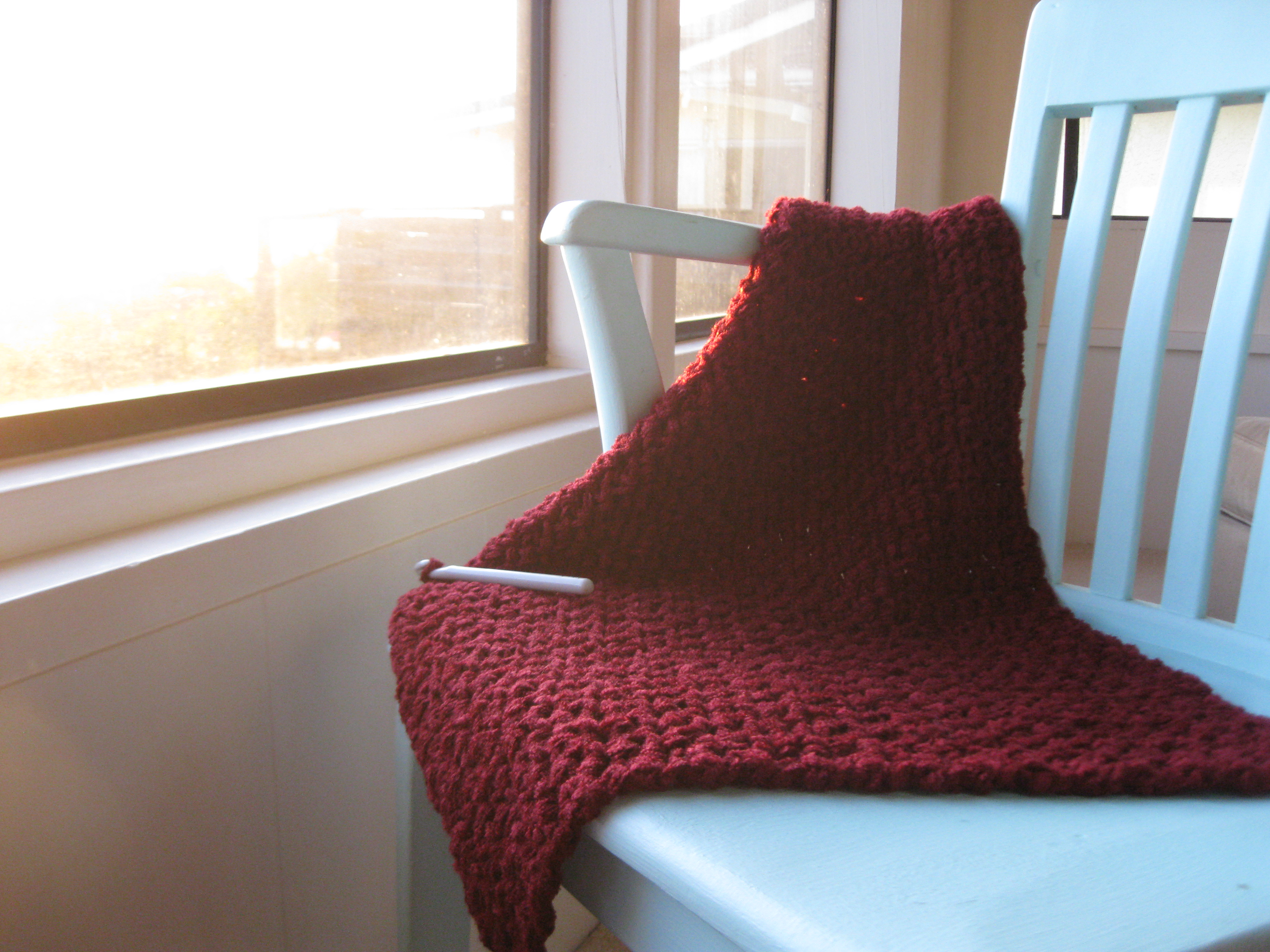 The yarn is TLC Amore by Red Heart.  It’s a blend of 80% acrylic and 20% nylon.  The color is Garnet.  When I bought this particular yarn several years ago, it was on sale and I really liked the color.  There were five skeins left in the bin, so I purchased all five.  At the time, I thought I would use the yarn to make a crocheted sweater, poncho, or wrap– something that I could wear, because the color was so pretty.  Then I got it home and tried to crochet a base chain just to start a gauge swatch, and I got frustrated.  The color and texture of the yarn made it hard to see where I needed to insert the hook to crochet my stitches.  I set the yarn aside and didn’t go back to it again until last week.