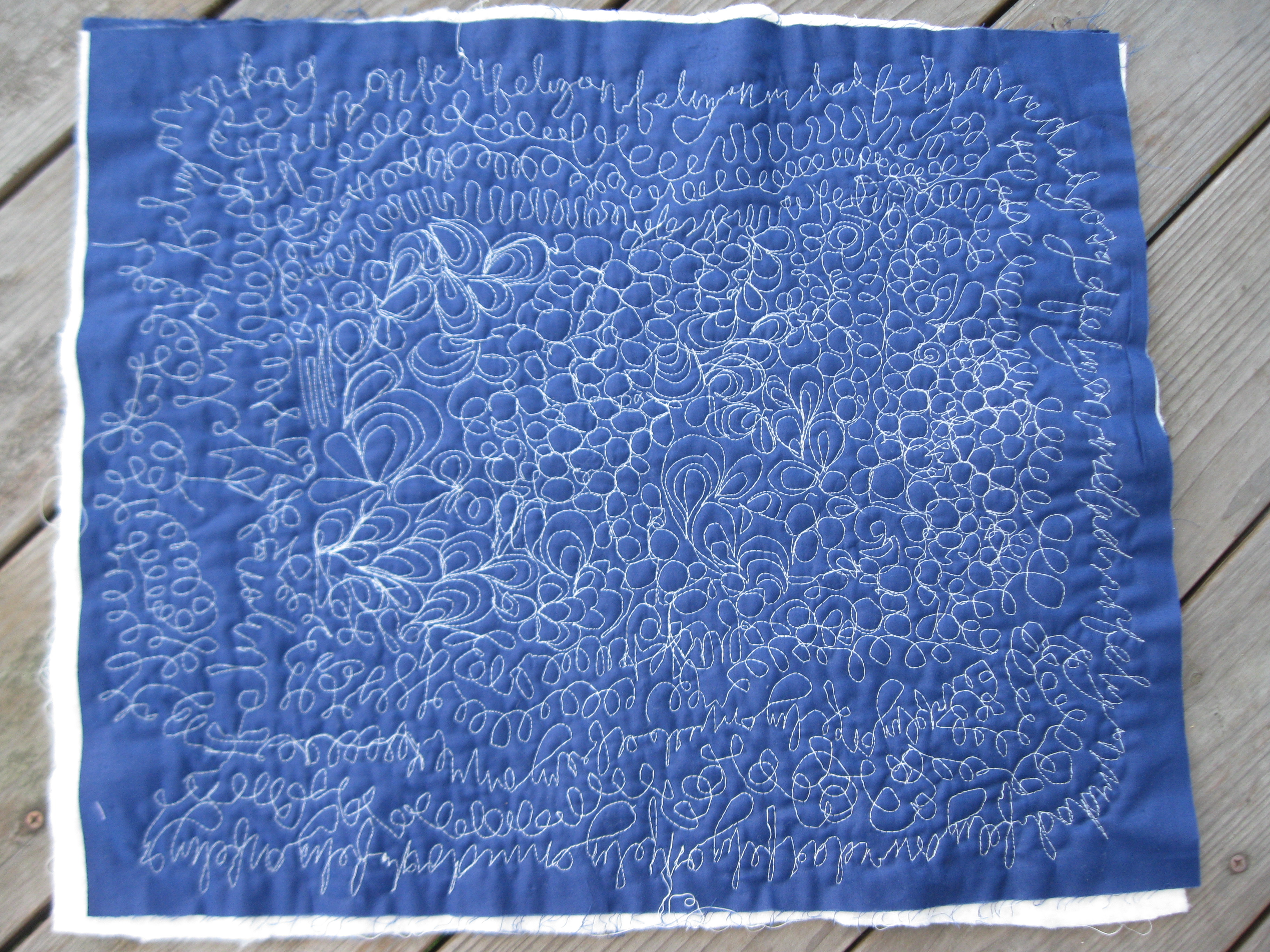 I spent most of today in a free motion quilting class for beginners. We learned how to prep our sewing machines for free motion quilting, and then our first assignment was to write our names. I wrote my first name over and over and over, the best I could in sewing machine cursive. It bugged me a little that I couldn’t dot the i in my name, though.