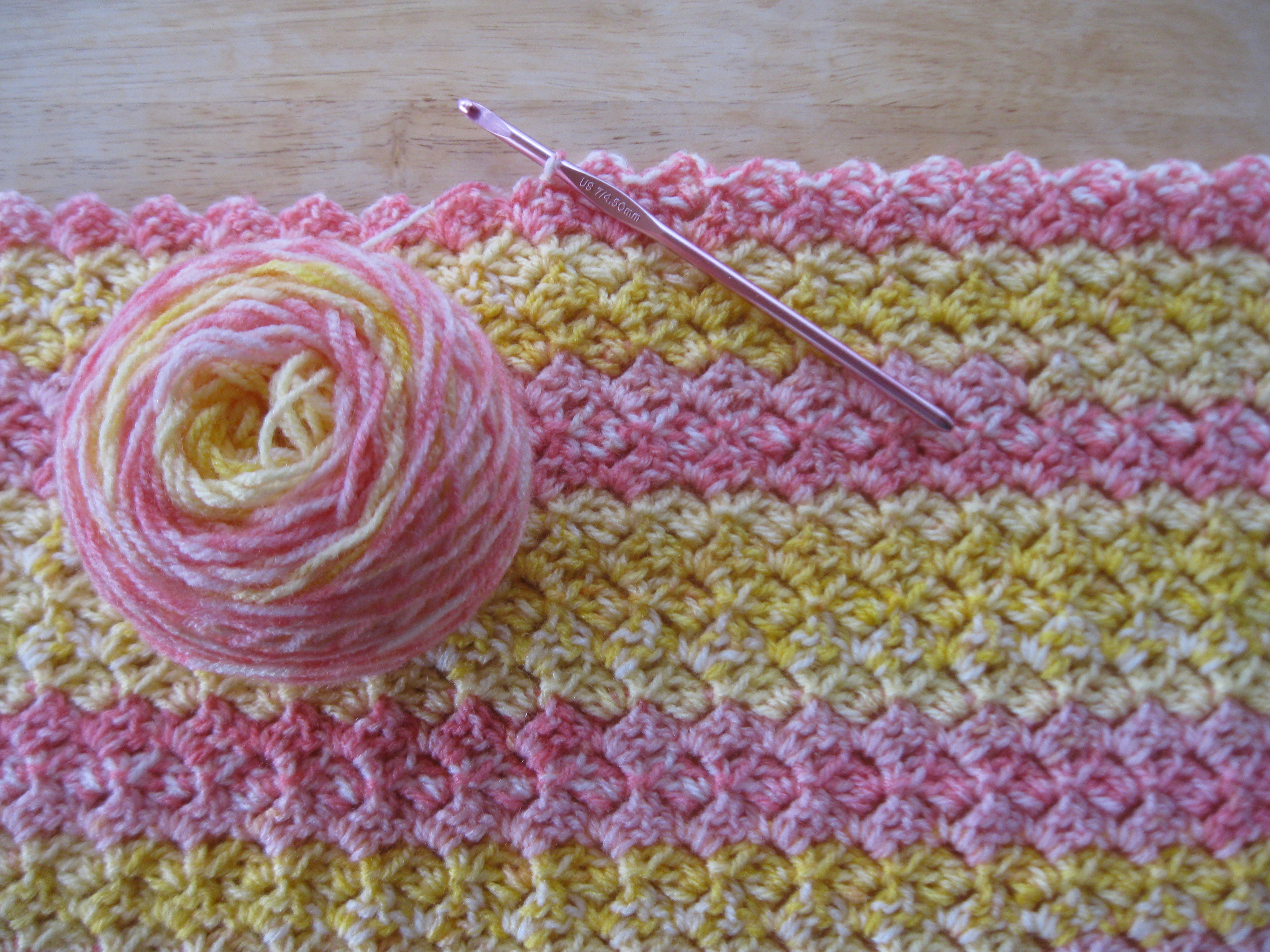 Remember the pink and yellow baby blankie that I was crocheting?  I had run out of the pink and yellow self-striping yarn, so I’d added another yarn in a similar weight and completely different brand.  My plan was to crochet a border around the existing rectangle and hope for the best.