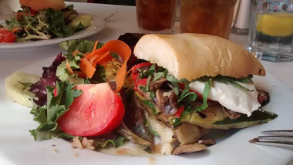 I drove us to Mama’s Meatball in San Luis Obispo. We ordered vegetarian sandwiches made with good homemade bread and fire-roasted vegetables including eggplant and peppers, with fresh mozzarella and basil.