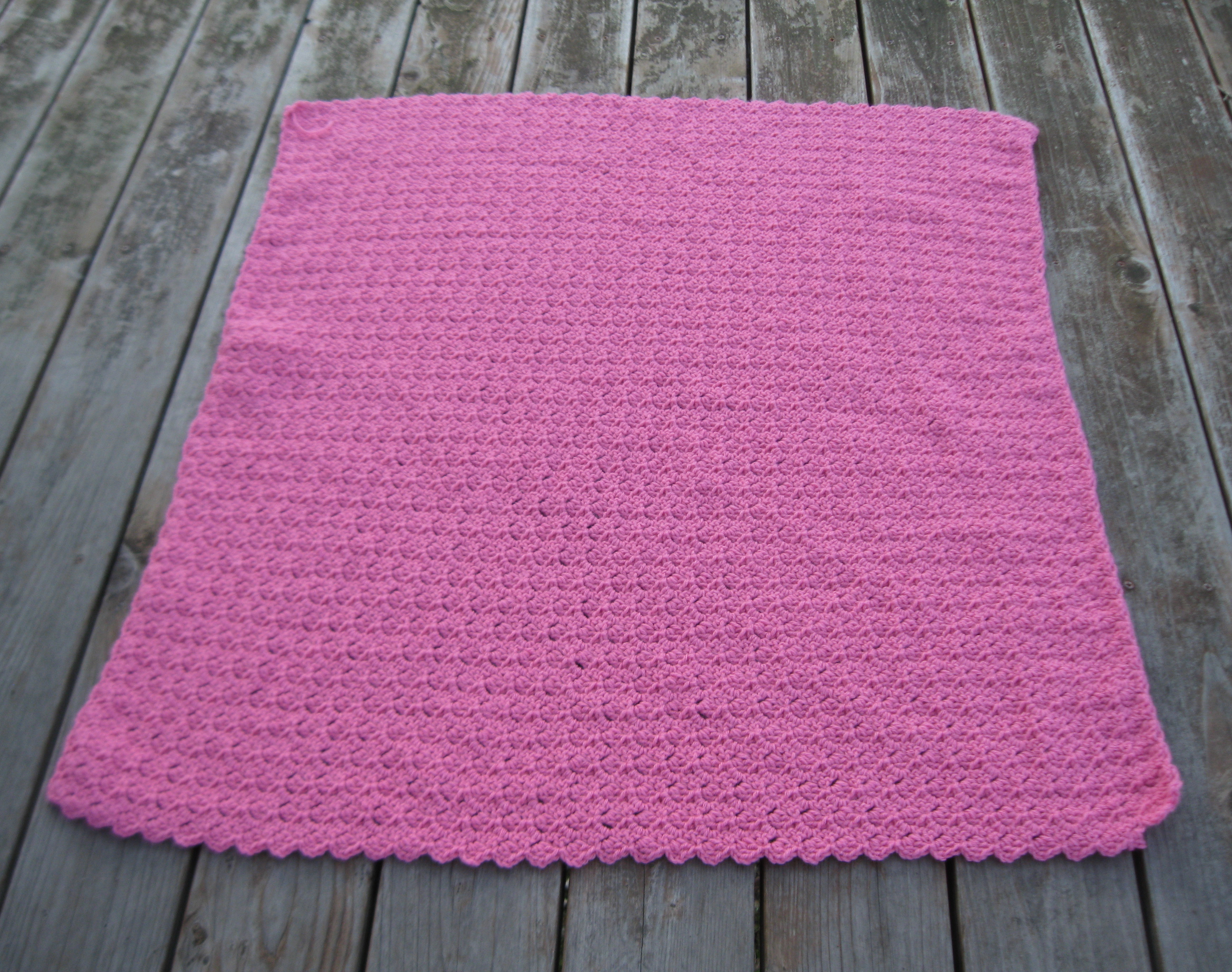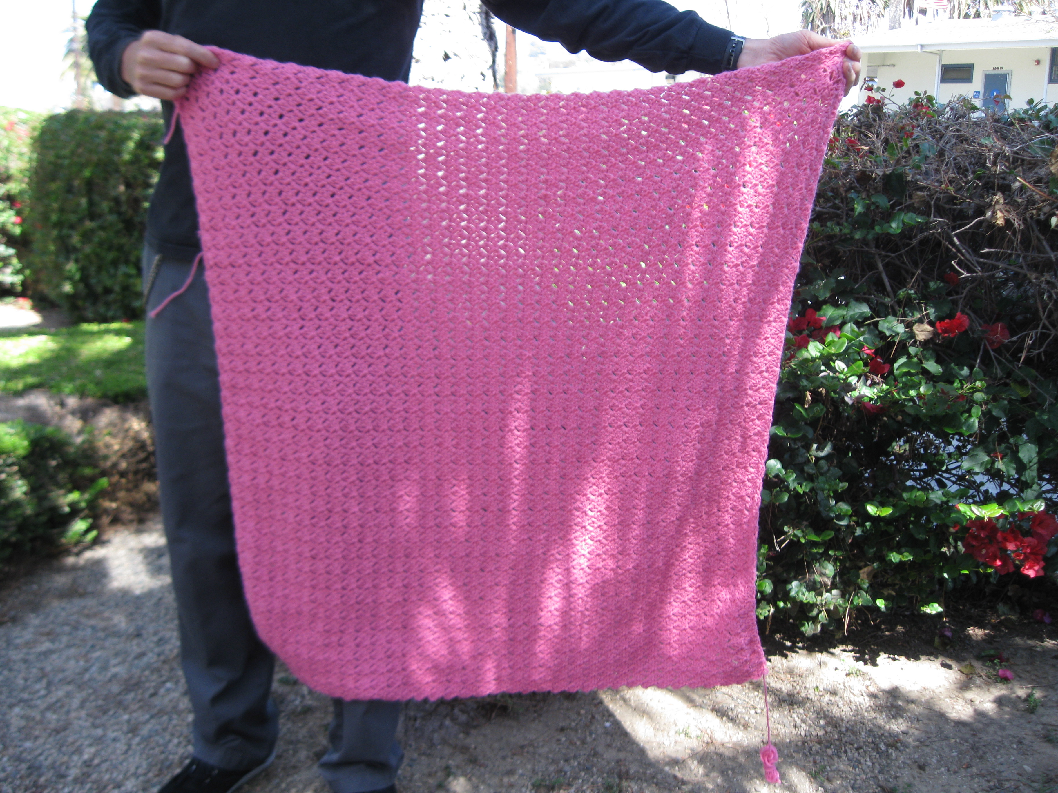 I used up my big ol’ Lion Brand Pound of Love Bubblegum ball of yarn.  In case you were curious, here’s what that much yarn can produce, in a repeating pattern of crocheted shell stitches: