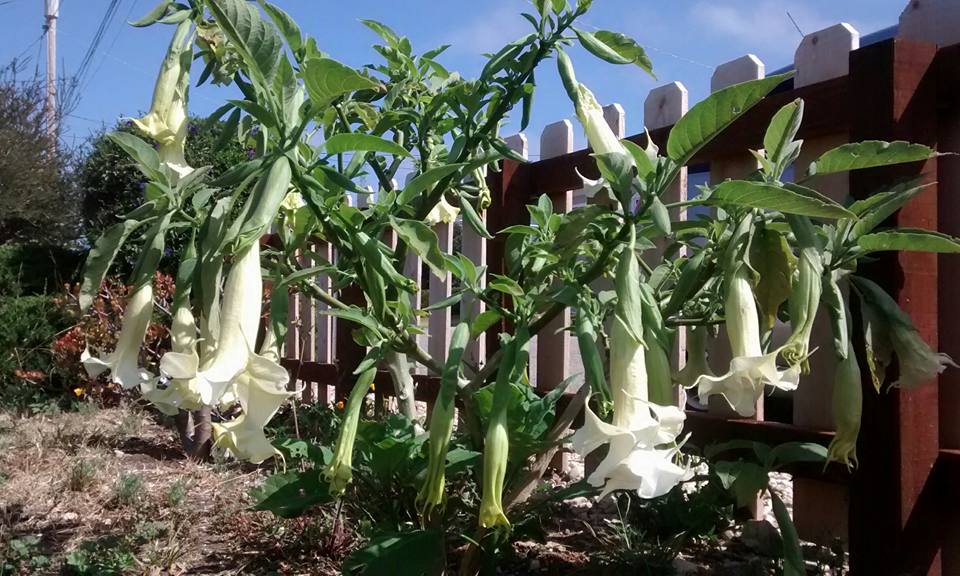 Last year on September 1st, one of my neighbors was offering a young angel’s trumpet plant free to anyone who wanted it. This neighbor had recently learned that the angel’s trumpet (aka brugmansia) was poisonous. She had a couple of dogs that she let run around in her backyard, and she didn’t want to take any chances of accidental dog poisoning.