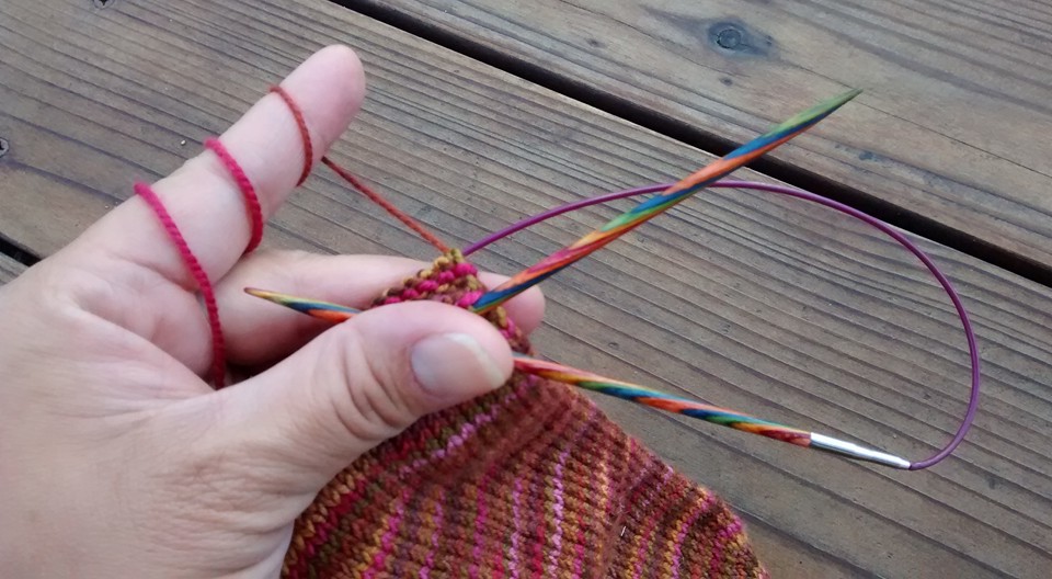 Without my fingers in the way, this is what the needles and yarn and sock and Magic Loop look like.