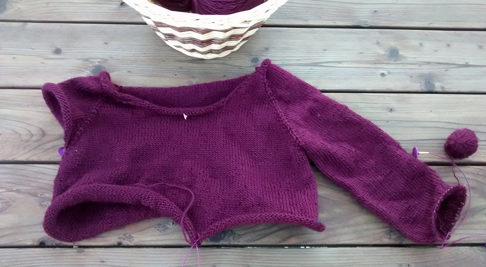 This is a knitted top-down sweater that I started about two years ago. The yarn is Berrocco Lustra, 50% Peruvian wool and 50% Tencel Lyocell.