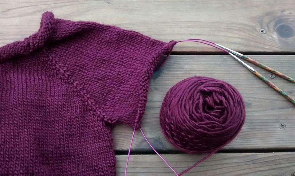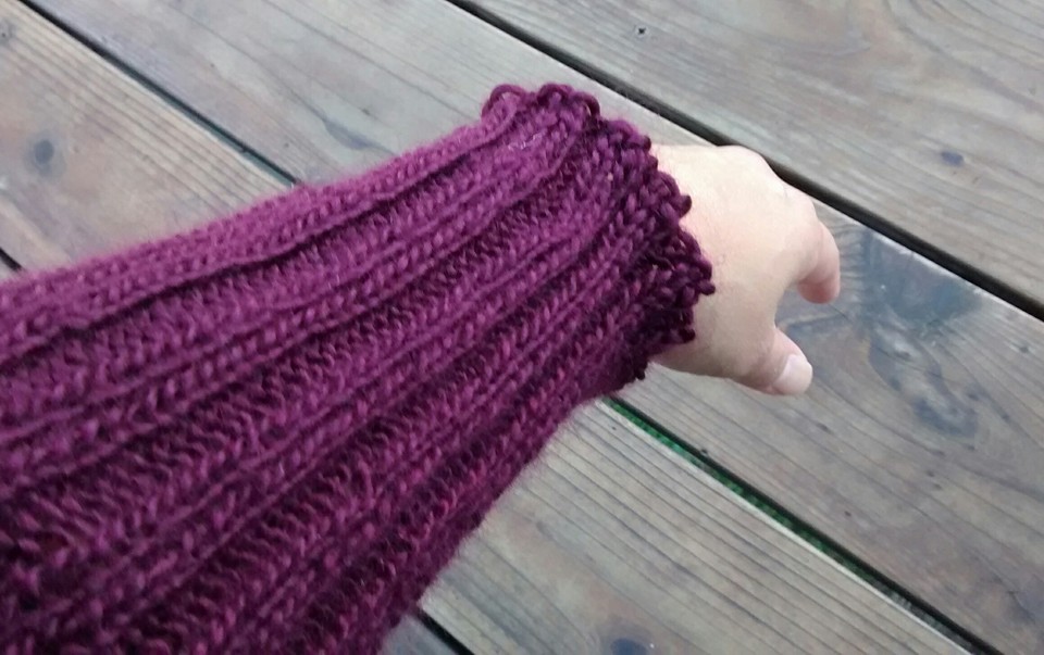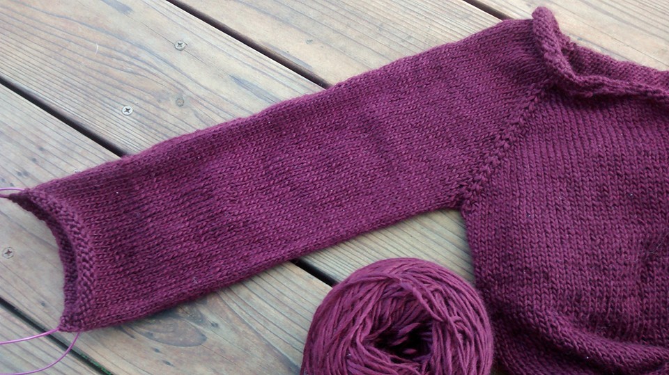 I’m not thrilled with the edge of that sleeve. I’ll probably frog all that ribbing and do something else later. (Oh! Maybe bracelet-length sleeves with a crocheted edge?) In the meantime, I’m going to start the second arm. I’m pretty sure a couple of my neighbors were wondering what I was doing out on the porch, taking selfies in what appeared to be a one-armed sweater.