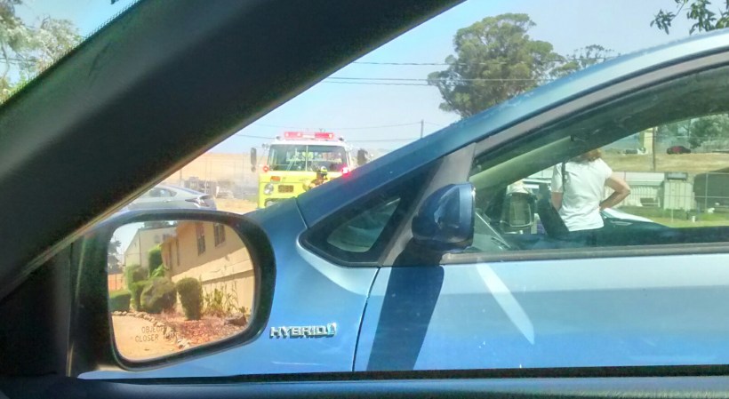 This week at work I had to attend an in-service training that was interrupted by a possible gas leak. We had to vacate the building, a wooden 1950s structure that you can see there in my car’s rearview mirror. Our facility has its own fire truck and firefighters, so they came right away. We had to wait for about forty-five minutes in the parking lot (I sat in my car), hoping to be told that training was cancelled and to go home– but no such luck. We just had to relocate to another building.