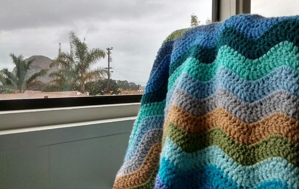 Throughout all this traveling and eating and donut-merrymaking, I didn’t get a whole lot done on my crocheted afghans. I brought along a sock to knit, but I might as well have left it home because I only managed to finish a few rows on it.