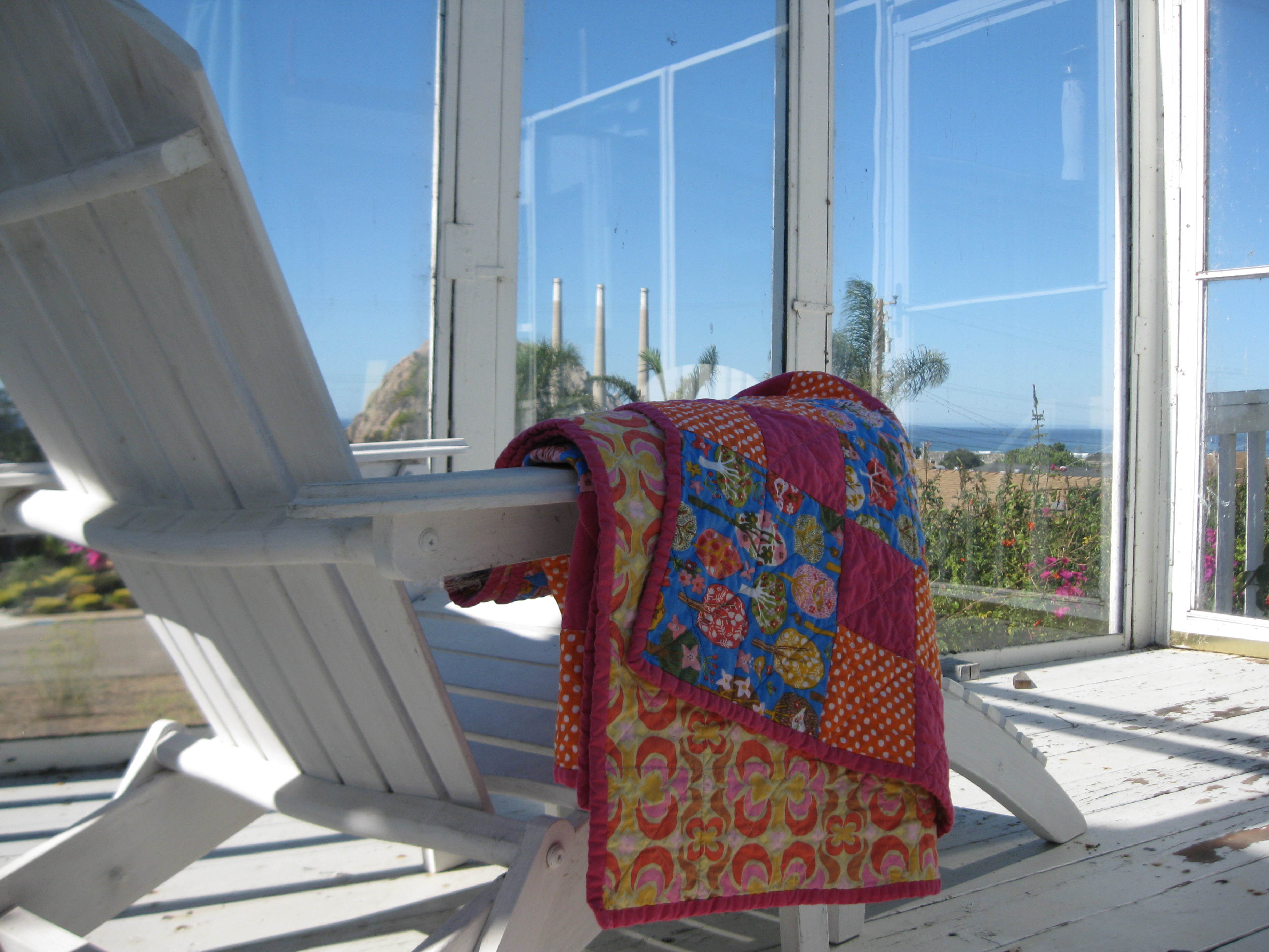 Anyway, rather than show you photos of my two current WIPs with one of them looking like no progress was made, I am sharing a photo of my first quilt instead. This is the patchwork quilt that I made in my Beginners Quilting class back in September and wrote about in this post. And that is our deck that needs painting and where you can see this view. Today was a really beautiful day with a clear blue sky and a flat, glassy ocean. If you’re ever in town, let me know and we can visit on the deck and enjoy the view. We’ll talk, knit, or crochet. I’ll pour you a glass of iced tea.