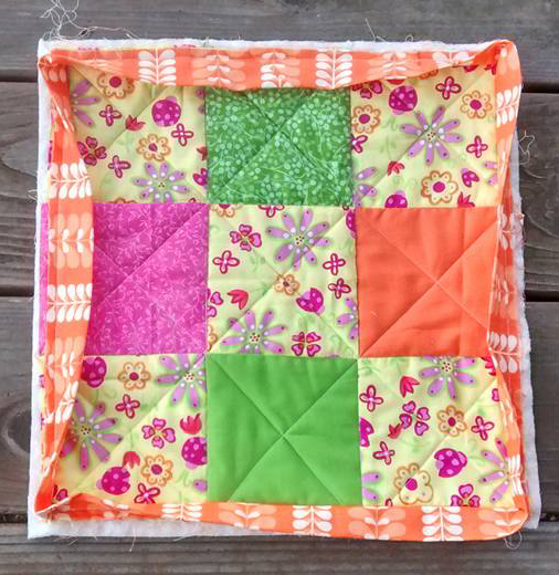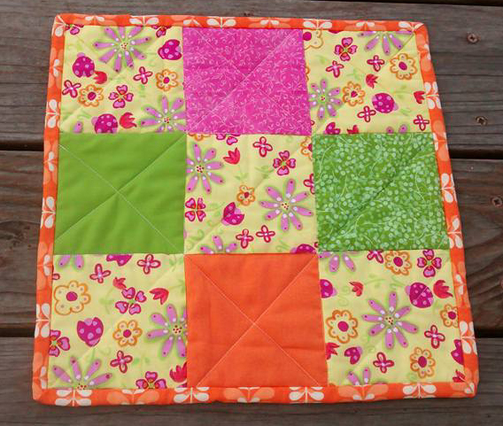 Remember the nine-patch blocks that I sewed last weekend, and the quilted placemat that was just waiting for me to hand-sew the binding in place?