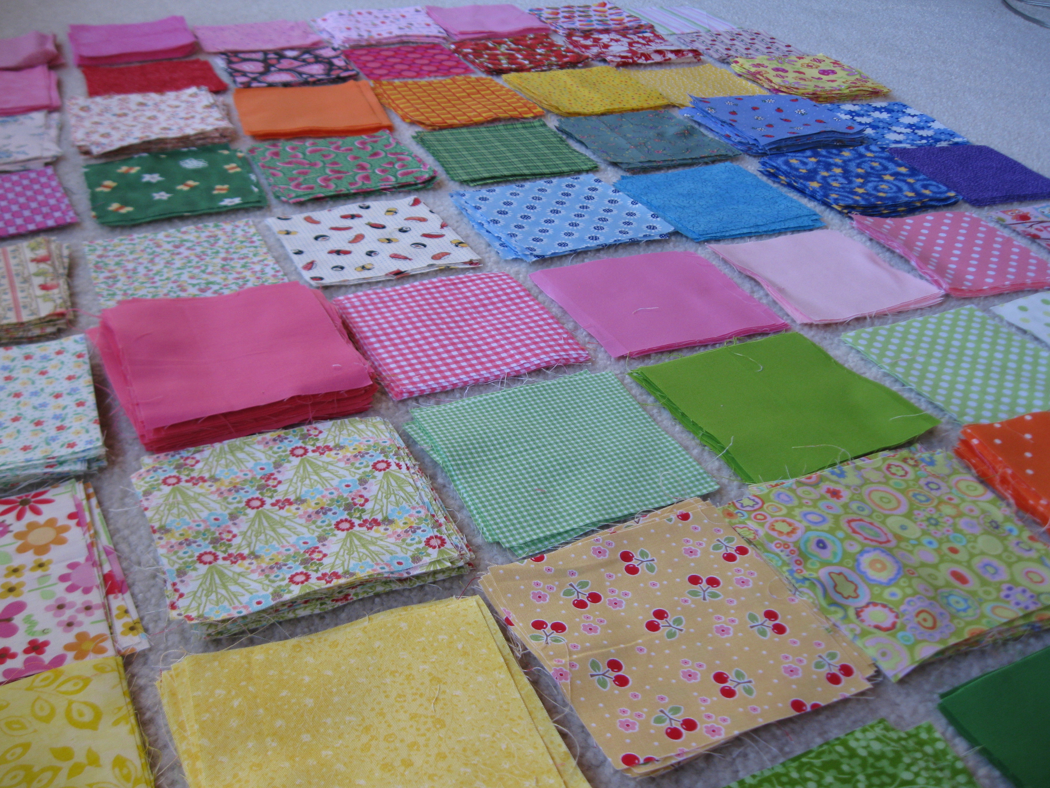 I bought a yard and a half of the yellow cotton. I was able to cut enough rectangular strips, but then I didn’t have quite enough for the squares. The bummer is that I would have had exactly enough fabric if only I’d been a lot more careful with my measuring before slicing away with the rotary cutter.