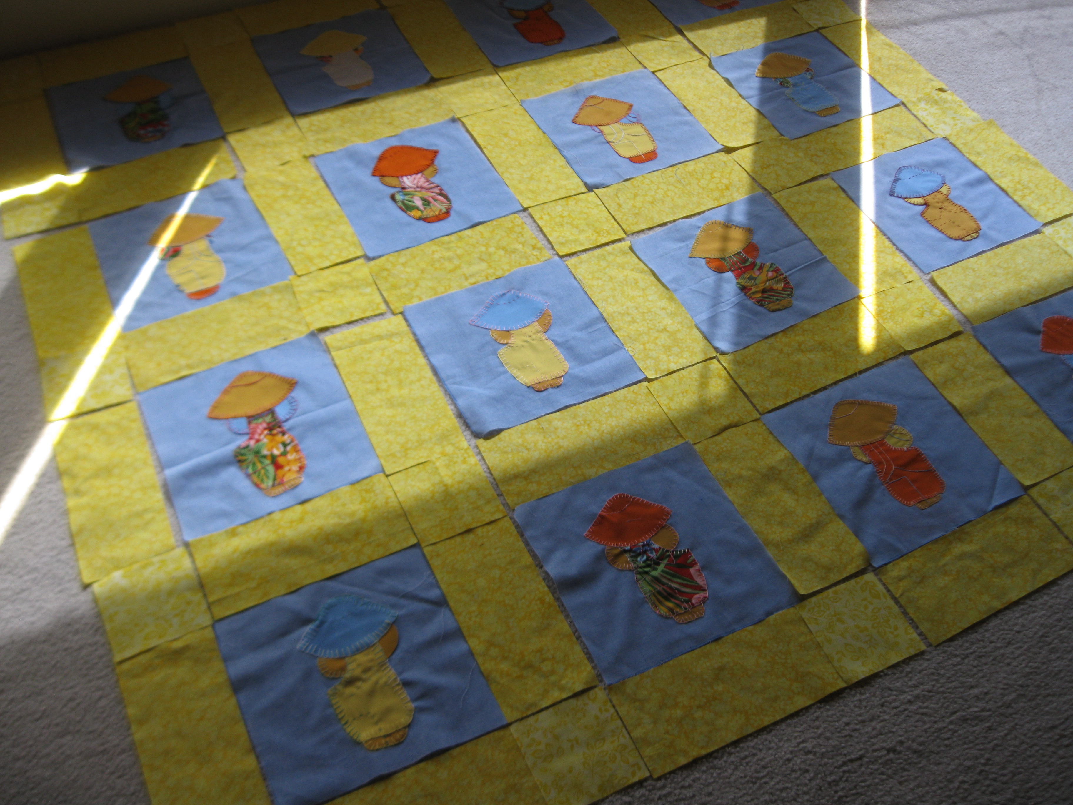 You can see where I used a different yellow fabric for the squares, but I think it turned out looking nicer that way.