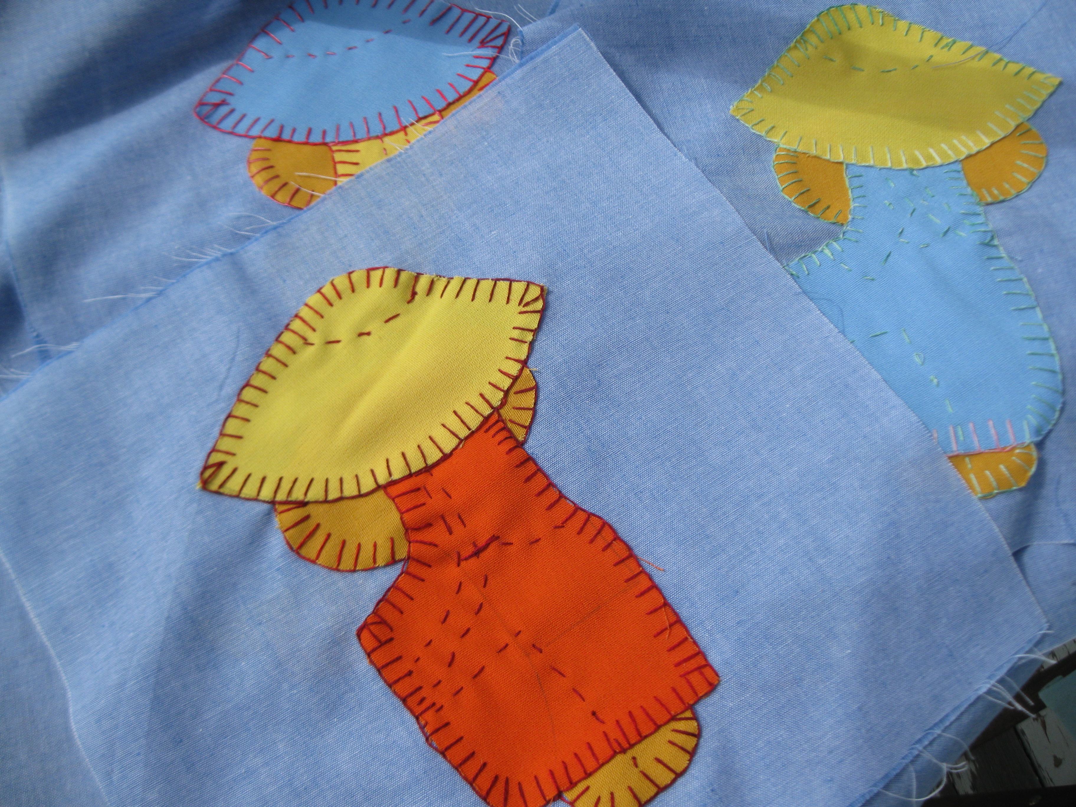 Back in 1987, my mom started this project of blanket-stitched appliquéd motifs on 10″ x 10″ blocks.